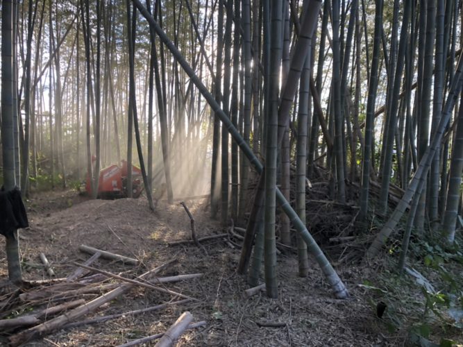 折れたり曲がったりしたものを中心に100本以上の竹を伐採し搬出。林内に放棄されていた枯れ竹はチッパー2台を使用して粉砕処理を行いました。